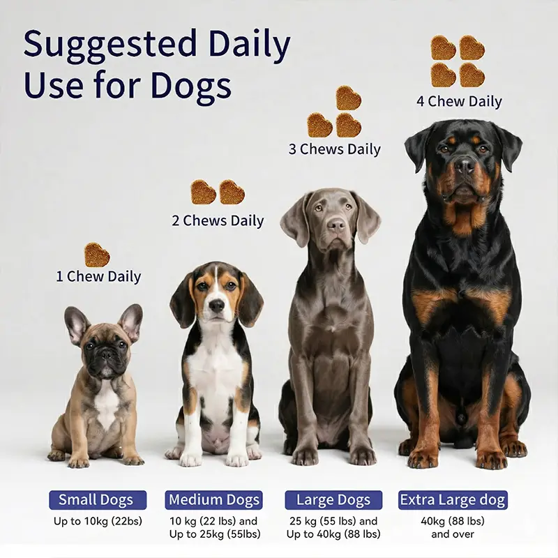 - Extra large dogs over 40kg: 4 chews